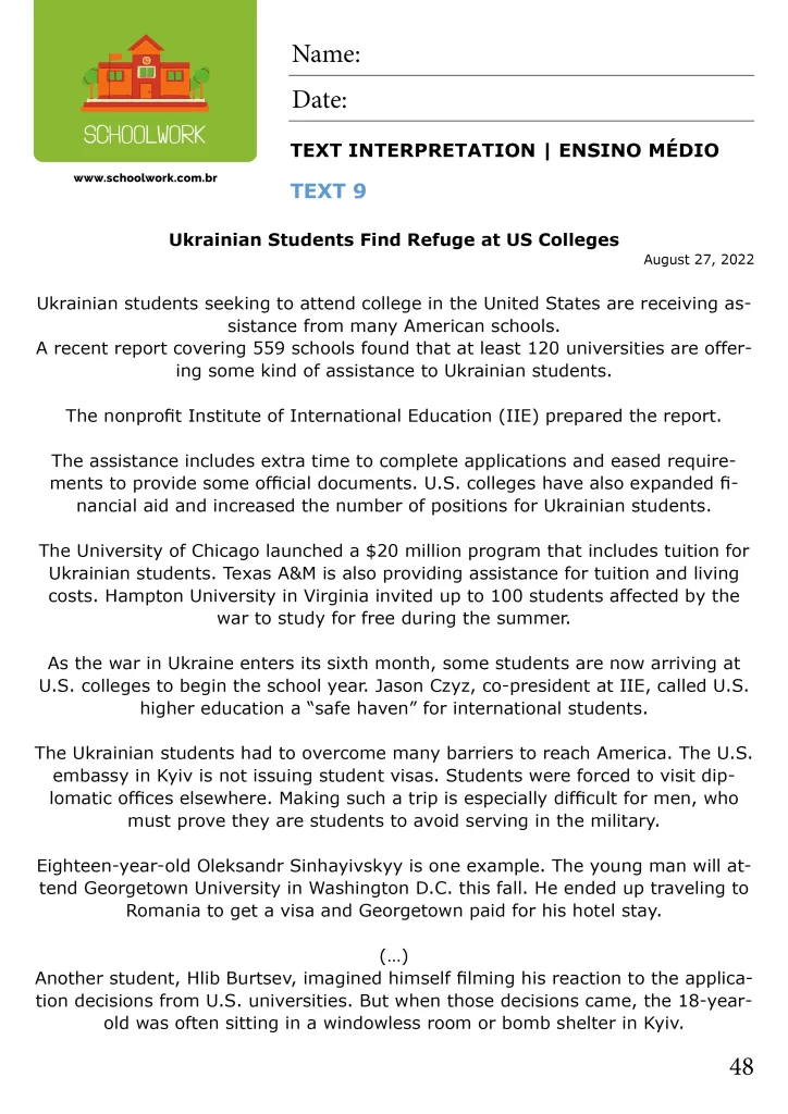 O Módulo de Interpretação de Texto para Ensino Médio tem 150 páginas com mais de 10 textos que foram usados de base para a criação de exercícios.