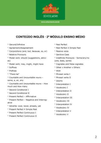 O Módulo 02 do SchoolWork conta com 95 páginas, ele é o segundo módulo para alunos do Ensino Médio e vem com Gabarito ao final da apostila. Garanta já o seu!